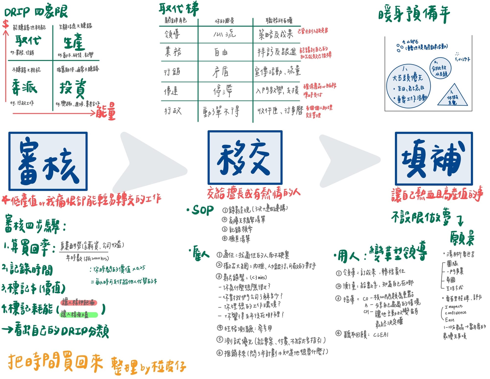 先透過取代梯,找到自己的定位,然後試著把手上的職務一步步交付出去,而透過灑出大網跟篩選,找到值得交付的人,然後要賦權、讓他們承擔責任,最後要認清員工要的是什麼,並且給他想要的,讓值得的人能夠好好做事且留下。