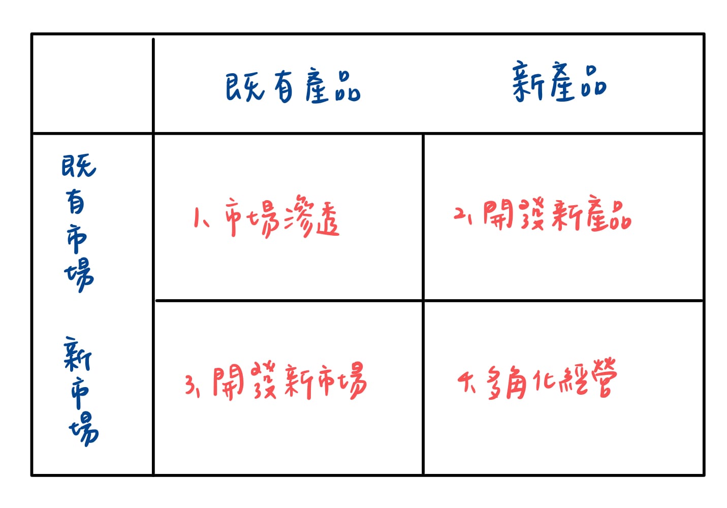 我首先利用:安索夫矩陣來分析目前公司的現況。關於安佐夫矩陣的應用及案例分享,在商業思維學院中的「商業開發學程-基礎」中的「公司成長策略」的這個單元有很詳細的課程說明。